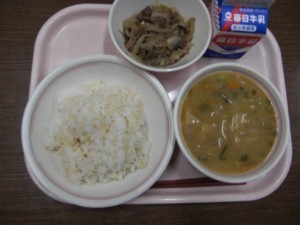 今日の給食は、牛乳・玄米ごはん・牛丼の具・みそ汁 でした。