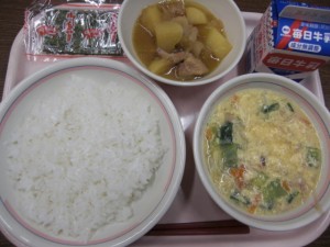 今日の給食は、牛乳・ごはん・味付けのり・鶏肉とじゃがいものさっぱり煮・卵スープ でした。