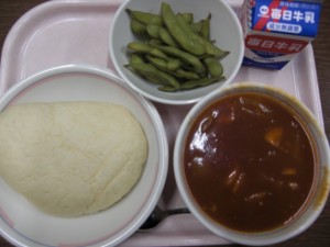 今日の給食は、牛乳・オリーブパン・ポークシチュー・枝豆 でした。