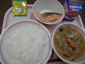 今日の給食は、牛乳・ごはん・野菜ふりかけ・鮭の塩焼き・スタミナみそ汁 でした。